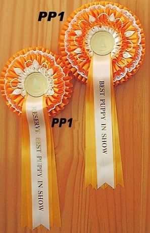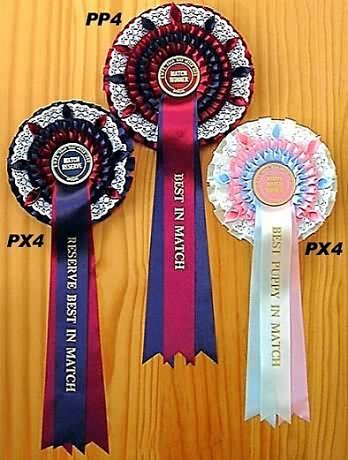 All rosettes have 5x38cm (15") long by 36mm (1.5") wide tails.